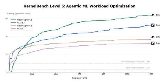 GLM-5.1 展现的长时间工作和自进化能力,让其从单纯的 “ 代码生成器 ” 进化为 “ 主动的系统优化器 ”。我们在涵盖 50 个真实机器学习计算负载的 KernelBench Level 3 优化基准上,让 GLM-5.1 对每个负载独立进行持续优化。在超过 24 小时的不间断迭代中,GLM-5.1 自主完成了多轮编译 — 测试 — 分析 — 重写循环,最终取得 3.6 倍的几何平均加速比,显著高于 torch.compile max-autotune 模式的 1.49 倍。